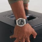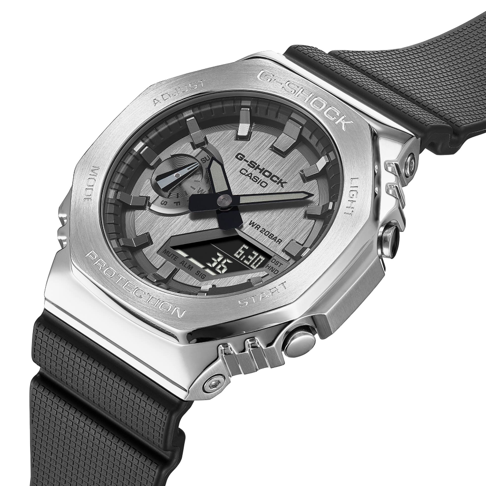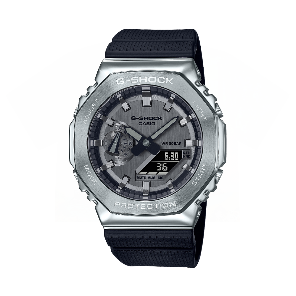 Go sleek, sharp and bold with a G-SHOCK standard-bearer in a metal-clad octagonal take on the original iconic design. Forged in stainless steel with rounded hairline finish, the strong bezel says super style all the way. The dial is treated with vapor deposition finish for a meticulously detailed metallic look that suits a classic metal G-SHOCK timepiece. Incremental variations in the detailed square dot texturing on the wristband take casual urethane materials up a notch.