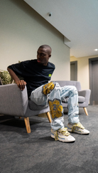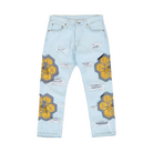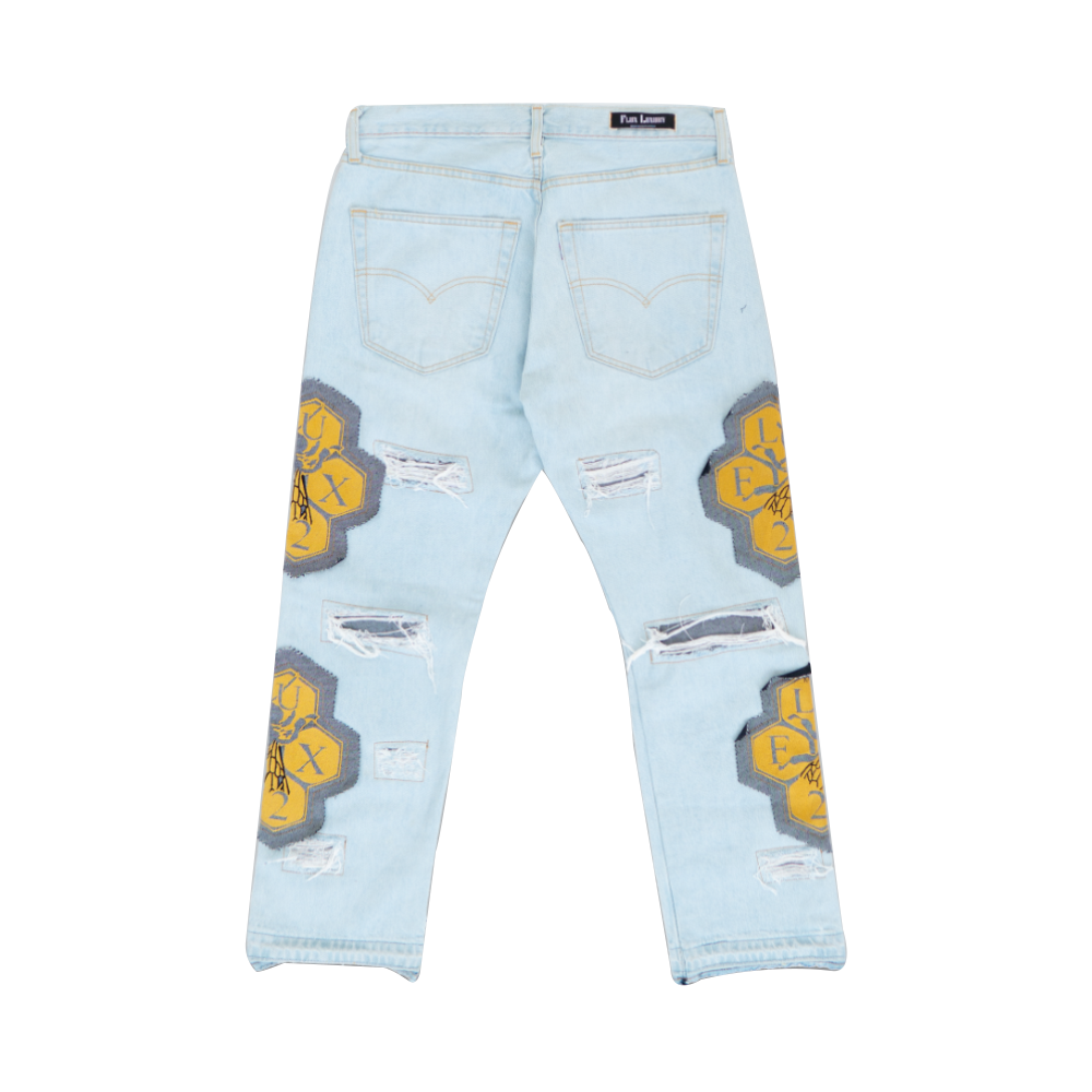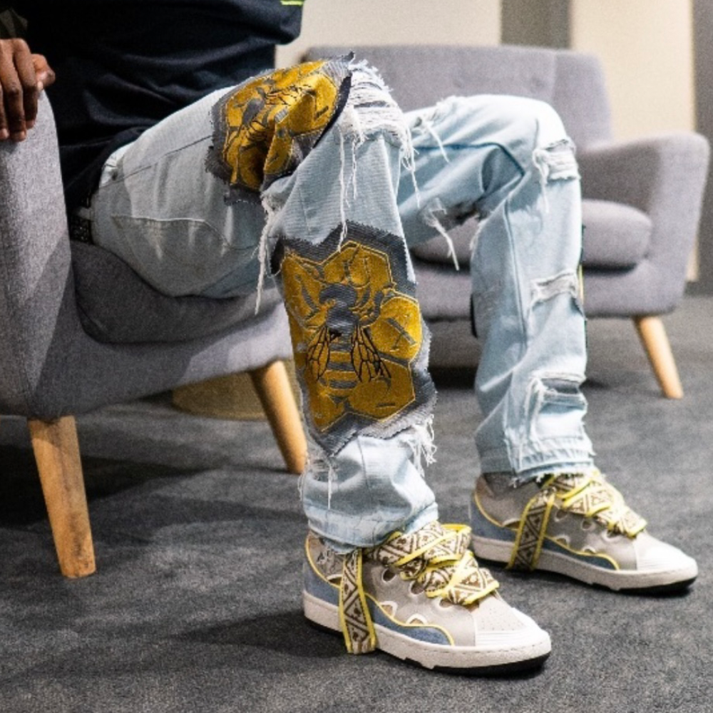 Step into bold artistry with the Beehive Blue Denim, a statement piece from FLUX Luxury Couture’s collection. Crafted from premium light-wash denim, this pair redefines streetwear with a luxury edge. Distressed detailing flows seamlessly into oversized honeycomb patchwork embroidery, complete with intricate bee motifs—symbolising strength, community, and resilience.