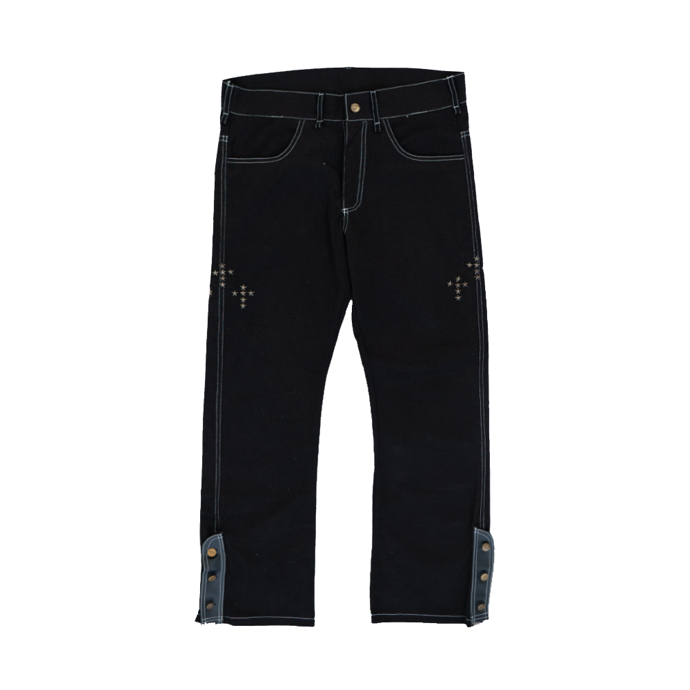 Signature detailing defines the piece: precision contrast stitching, subtle cross-stitch embroidery at the thigh, and statement buttoned flares at the hem—designed for versatile styling over sneakers or boots. The result is a bold, architectural look that balances luxury craftsmanship with contemporary edge.