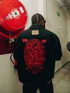 The jacket features a structured silhouette with reinforced seams, custom FLUX branding and a powerful red graphic across the back, delivering a strong visual identity from every angle. Paired with matching denim trousers, the set maintains a balanced fit that blends street functionality with luxury edge.