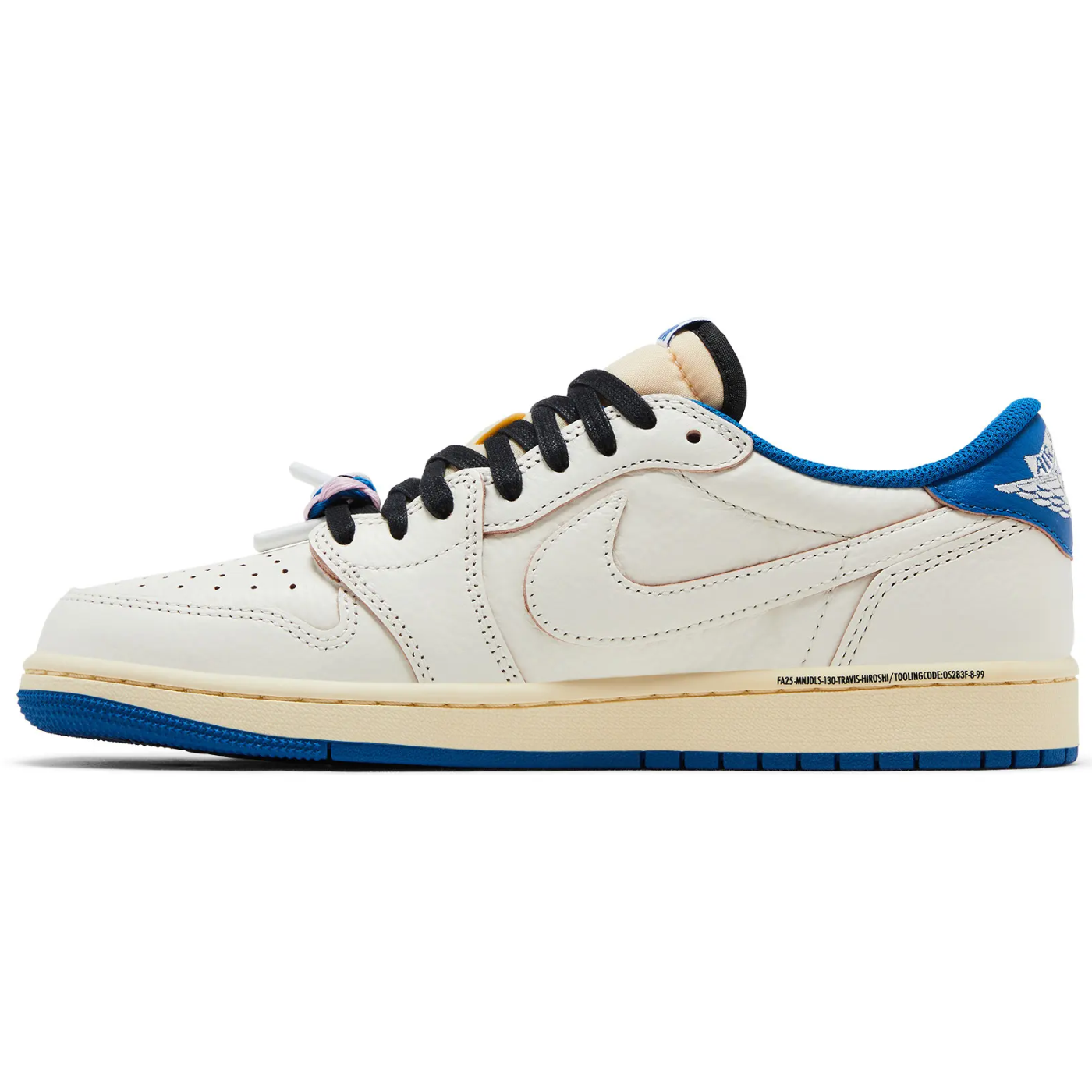 The Fragment Design x Travis Scott x Air Jordan 1 Low OG SP 'Sail Military Blue' utilises smooth white leather with tonal Swoosh branding on the medial side. On the lateral side, a reverse tumbled leather Swoosh stands out in a contrasting royal blue finish. The latter hue is repeated on the collar lining and back tab, featuring mismatched Cactus Jack and Wings logos. A vintage off-white finish is applied to the textured midsole, supported underfoot by a grippy blue rubber outsole.