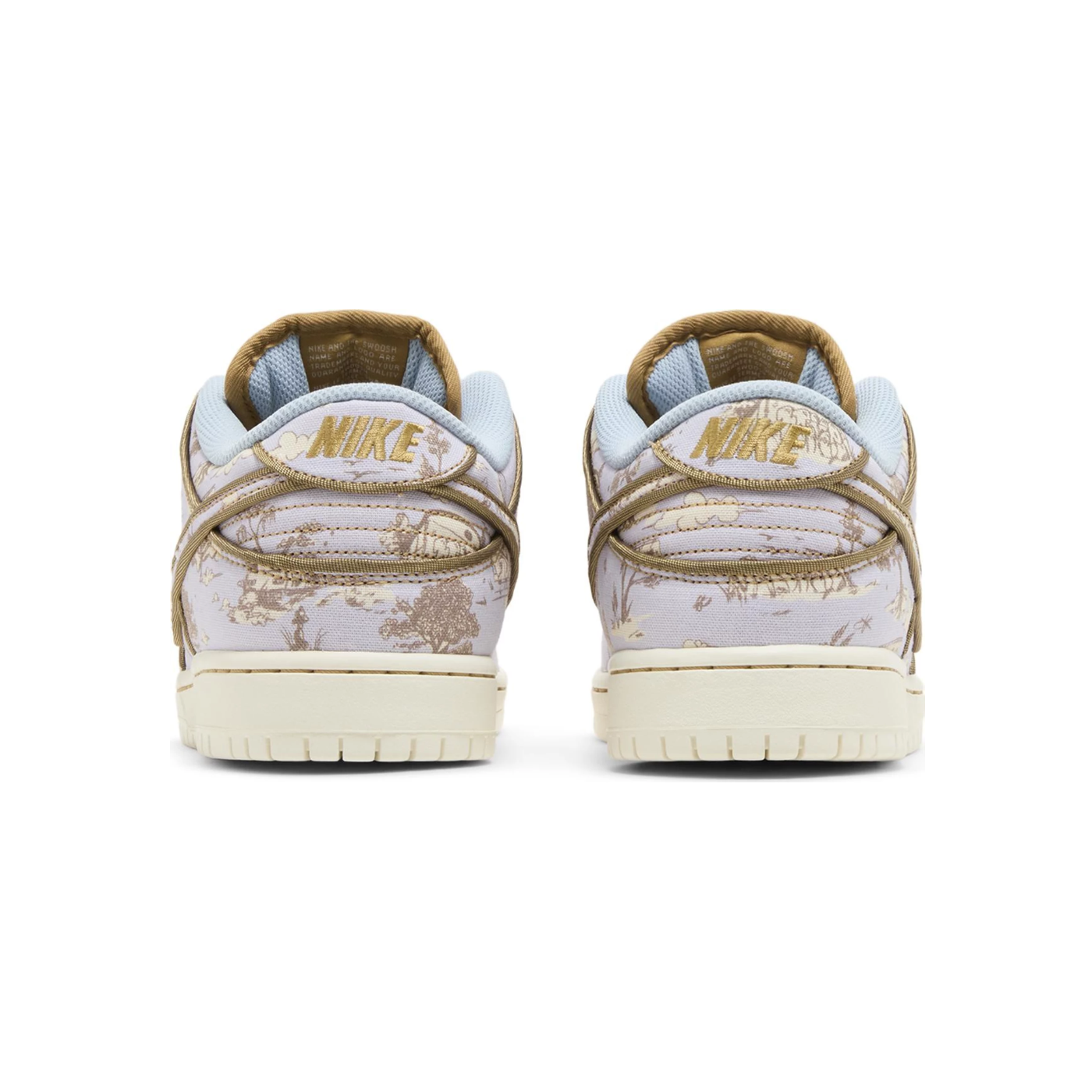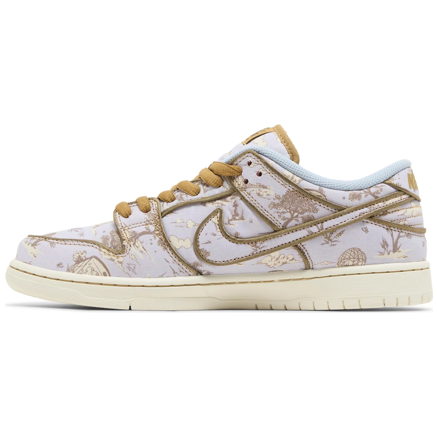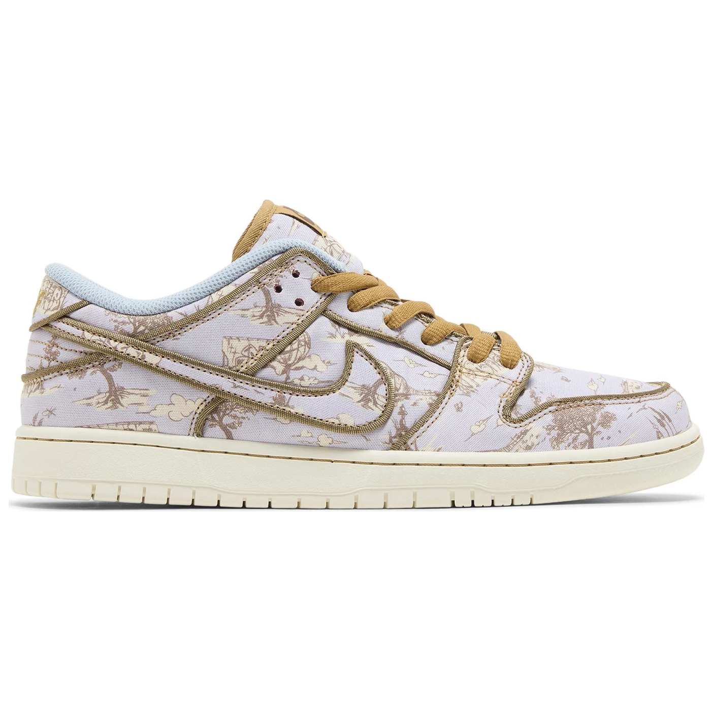 The Nike Dunk Low Premium SB ‘City of Style Pack’ dons a grey canvas upper covered in bucolic graphics depicting fluffy clouds, soaring birds and leafy trees. Brown piping outlines the Swoosh, eyestay, and forefoot and heel overlay. A tan Nike SB tag adorns the stuffed tongue, while a Nike wordmark is embroidered in bronze lettering on the back tab. A solid off-white finish is applied to the rubber cupsole, featuring stitched sidewall construction and an outsole equipped with a hardwood-ready pivot circle.
