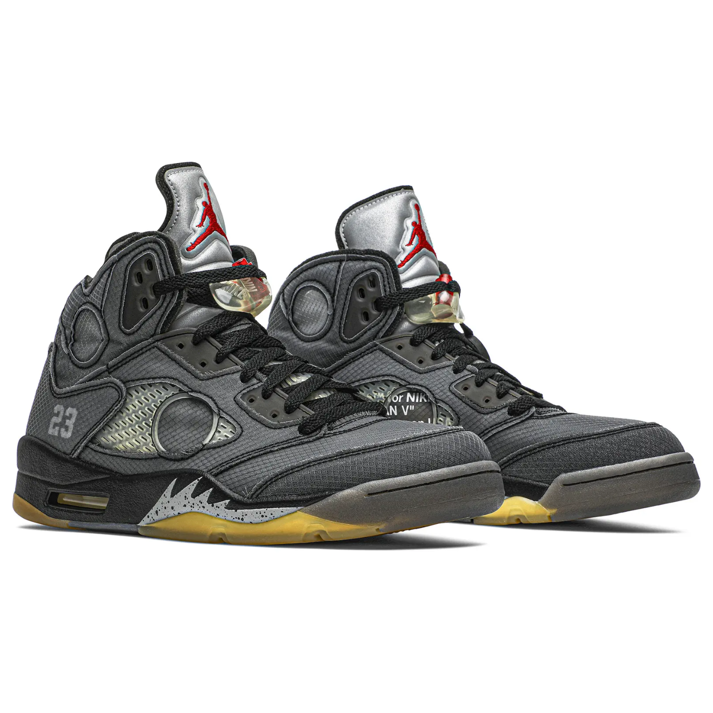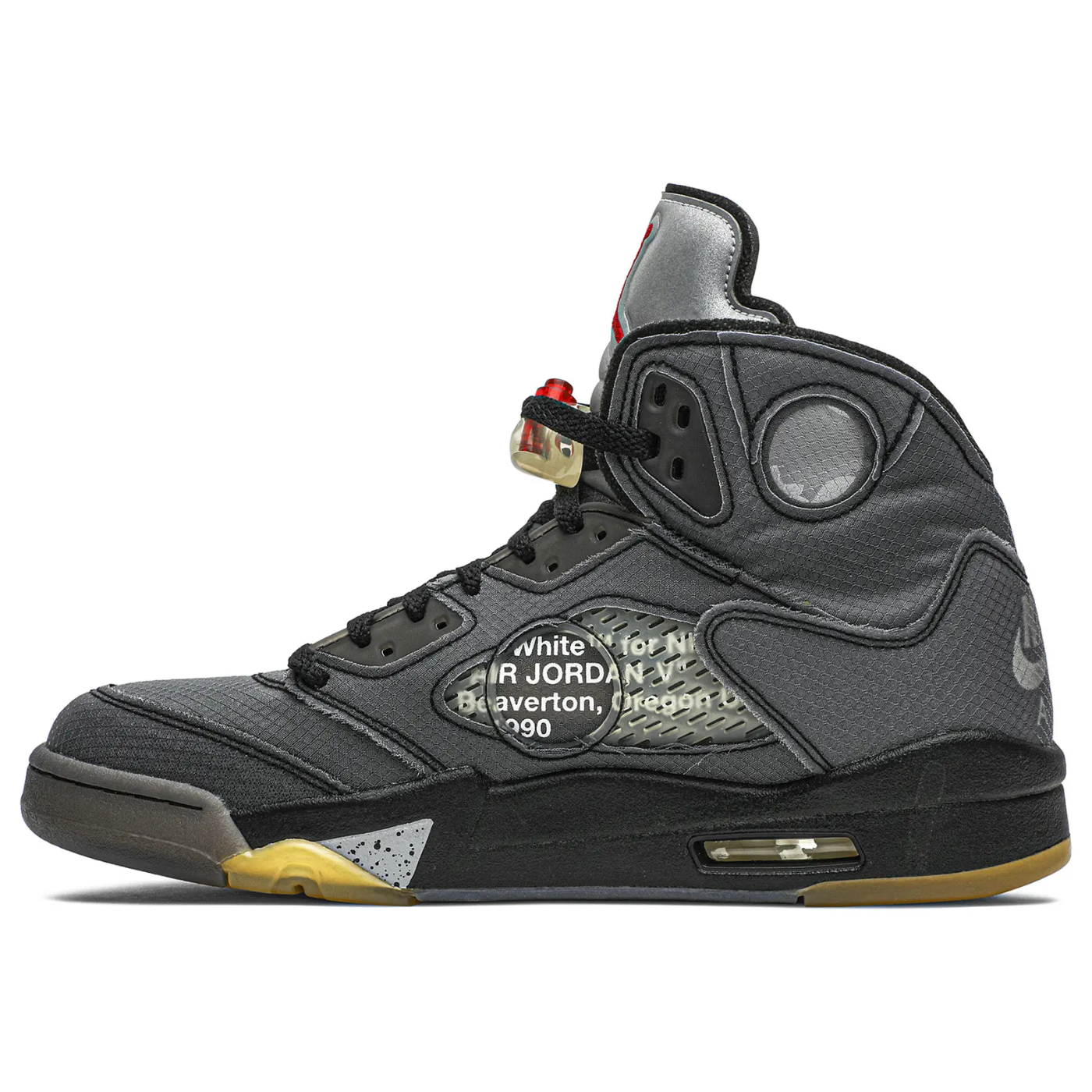 The Off-White x Air Jordan 5 SP 'Muslin' delivers Virgil Abloh’s stylized take on the retro silhouette. The faded black textile upper blends traditional details, including a silver reflective tongue and embroidered Nike Air branding, with Virgil’s signature text on the laces and medial-side quarter panel. A pre-yellowed translucent rubber outsole adds to the sneaker’s vintage aesthetic.