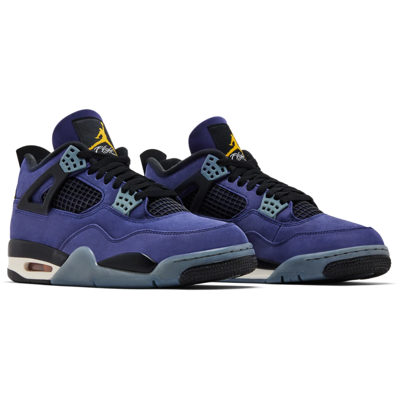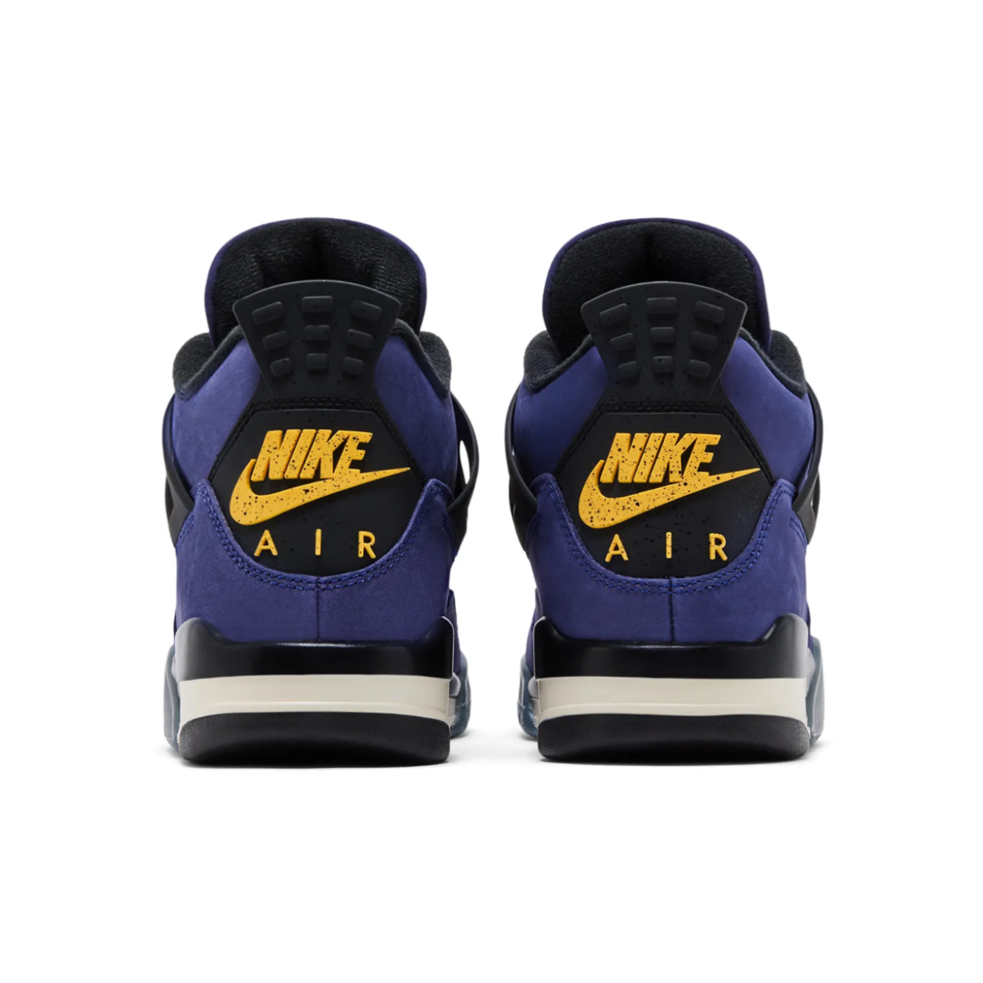 The Air Jordan 4 Retro 'Lakers' gets dressed in the signature colours of the storied NBA franchise. A dark purple nubuck upper features contrasting black accents on the TPU support wings, breathable quarter panel netting and heel tab, marked with a Nike Air logo in a golden yellow hue. A matching yellow Jumpman icon decorates the woven tongue tag. The sneaker rides atop a two-tone polyurethane midsole in black and white. A yellow-tinged Max Air unit in the heel provides impact protection and a comfortable ride.