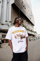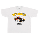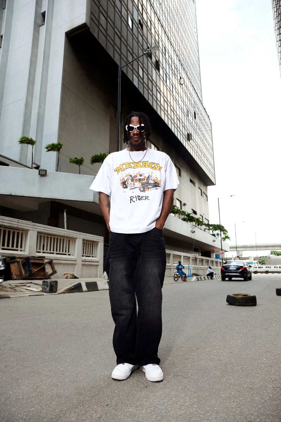 The front of the tee features a striking and intricate illustration, capturing the essence of urban anarchy and untamed freedom. The juxtaposition of chaotic elements and a menacing figure creates an aura of mystery, inviting curiosity and admiration from onlookers.