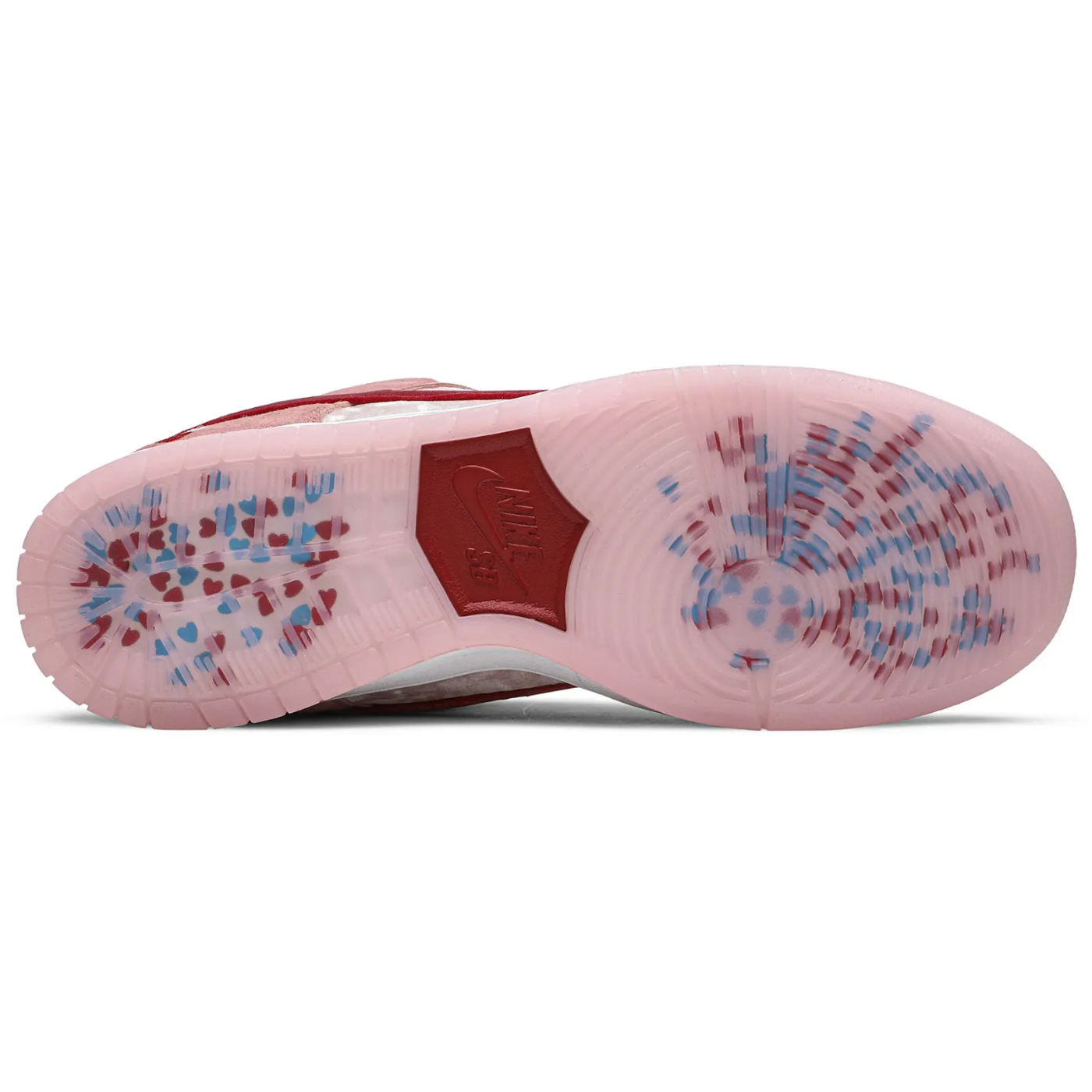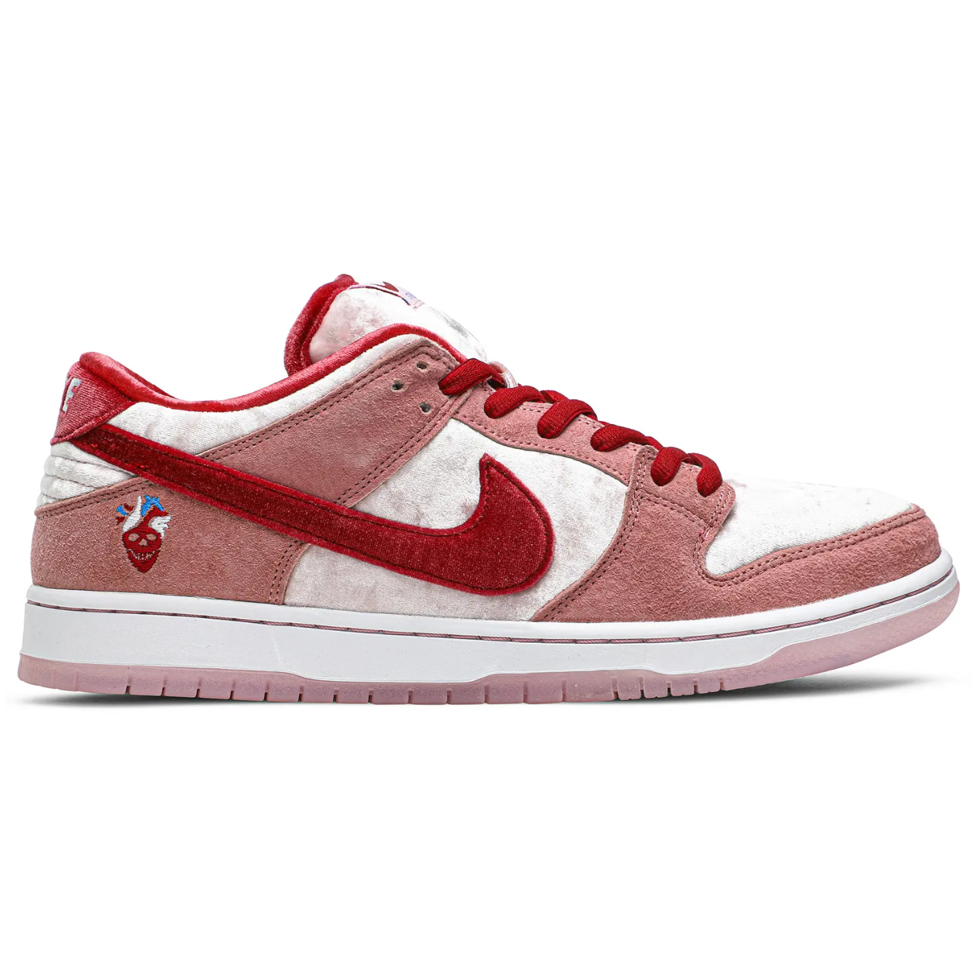 Made in collaboration with Sean Cliver’s skate brand, the StrangeLove x Dunk Low SB QS 'Valentine's Day' celebrates the romantic holiday with a plush take on the retro silhouette. The upper is constructed from white crushed velvet with pink suede overlays and a red velvet Swoosh. Cliver’s ‘Heart Skull’ graphic is embroidered on the lateral heel, while the translucent pink rubber outsole reveals an array of scattered hearts in contrasting red and blue tones.