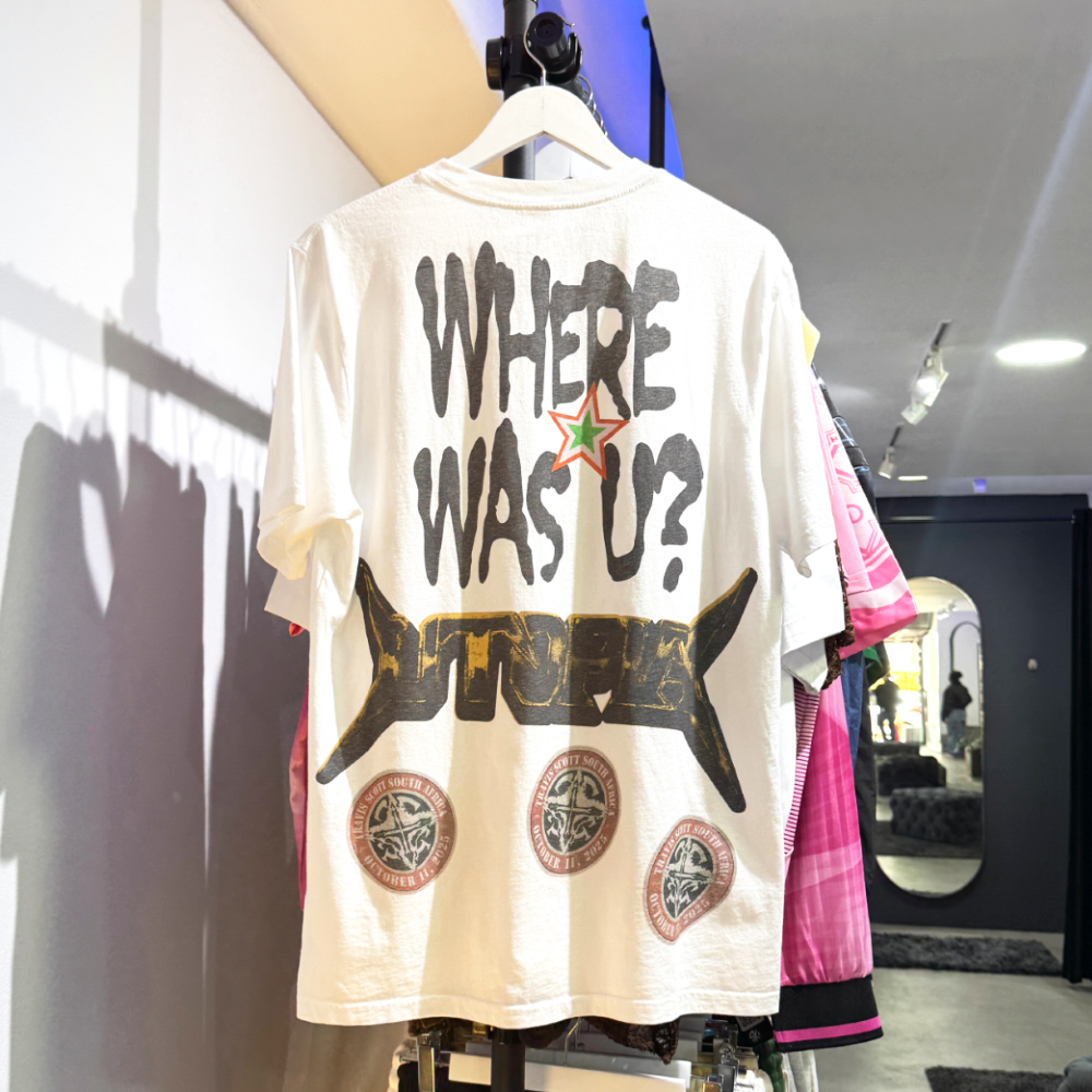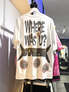 The front features a roaring bear graphic engulfed in green flames with orange graffiti-style lettering and star motifs, symbolizing Travis’s explosive stage energy and surreal UTOPIA aesthetic. On the back, the standout “WHERE WAS U?” slogan and oversized UTOPIA logo capture the tour’s theme of presence, energy, and cultural unity — completed with circular emblems commemorating the tour stop.