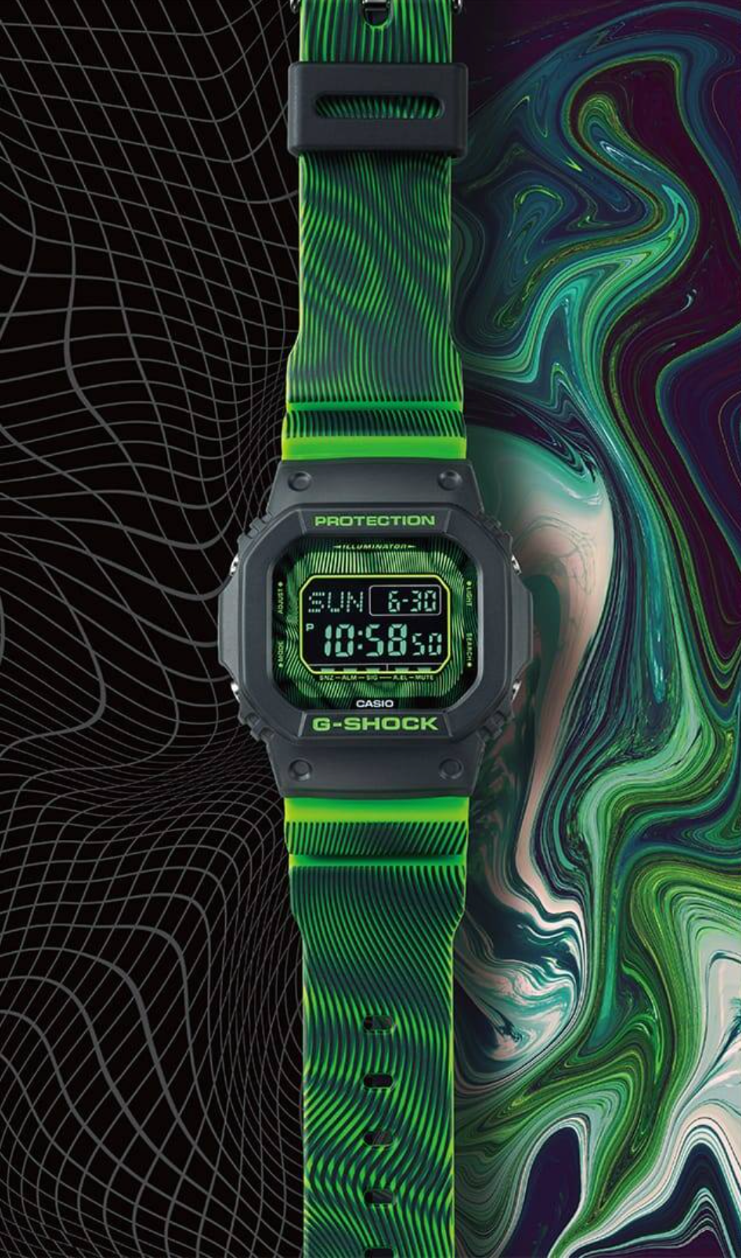 Jump into a time warp! Time Distortion watches make an impact as powerful as the G-SHOCK itself. The band and dial are printed in patterns that playfully distort time and space in vibrant fluorescent colours that transport you into the world of science fiction.