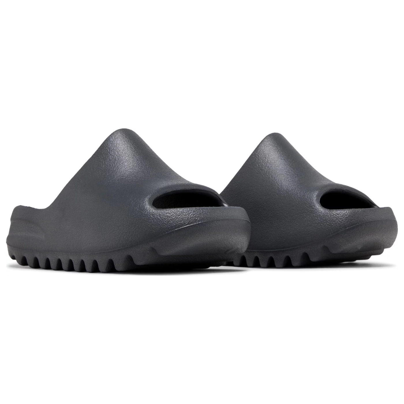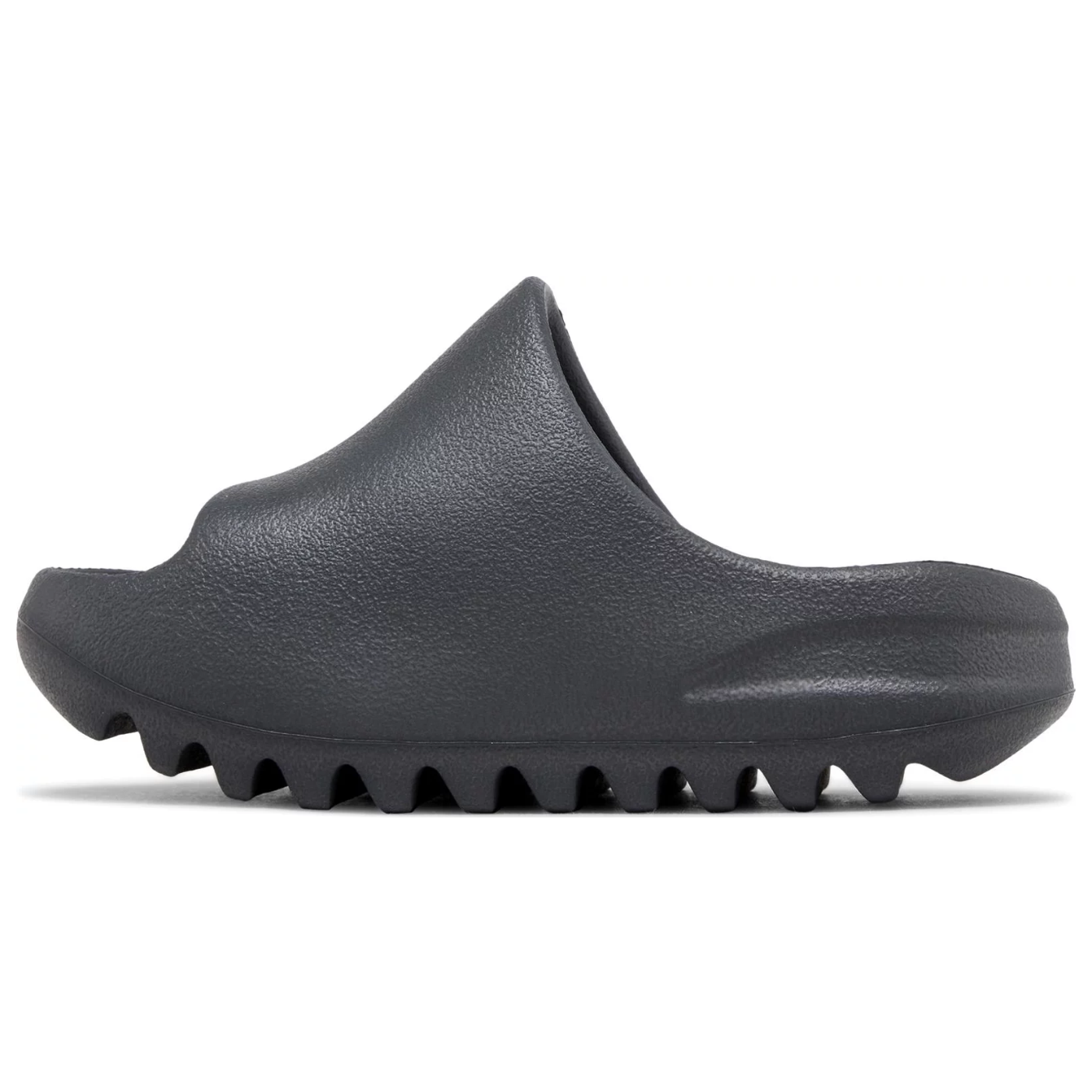 The adidas Yeezy Slide Kids 'Slate Grey' brings a stealthy color palette to the minimalist slip-on silhouette, featuring lightweight and durable construction made with a single piece of injected EVA foam. Exterior branding is limited to adidas' three-stripe logo debossed on the footbed, equipped with a soft top layer for improved comfort. Underfoot, the outsole utilizes strategic groove placement for impact protection and a smooth, flexible ride.