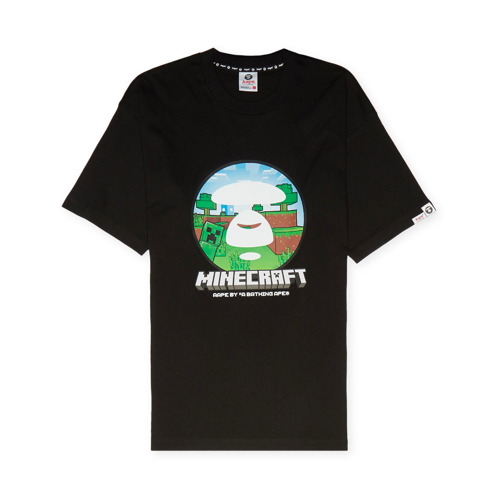 Crafted from premium cotton, this black short-sleeve tee features a custom pixelated Moonface logo set within a Minecraft-inspired landscape, alongside a Creeper graphic. The co-branded print and “AAPE BY A BATHING APE®” text mark this as a standout collector’s piece that bridges virtual and real-world style.