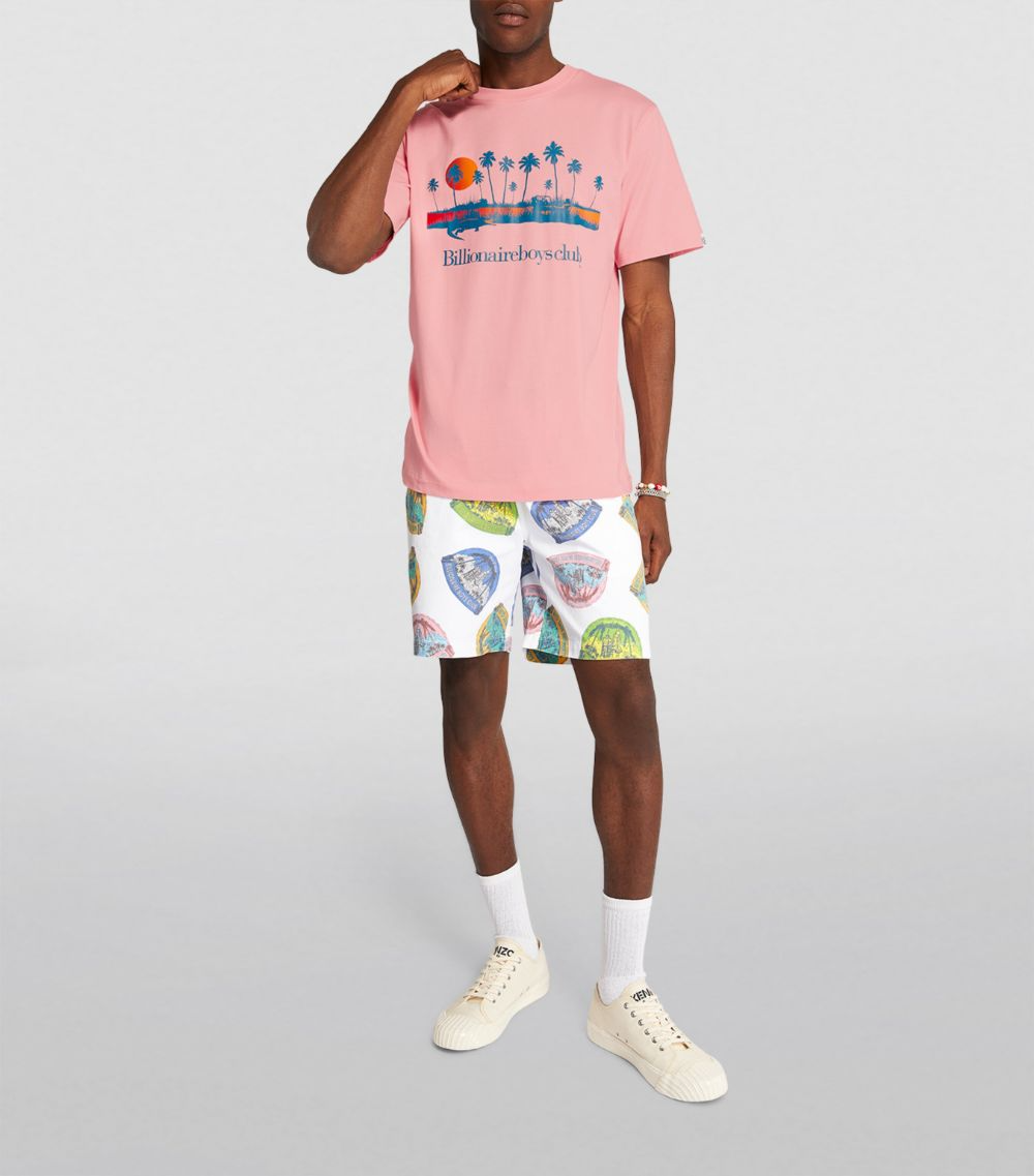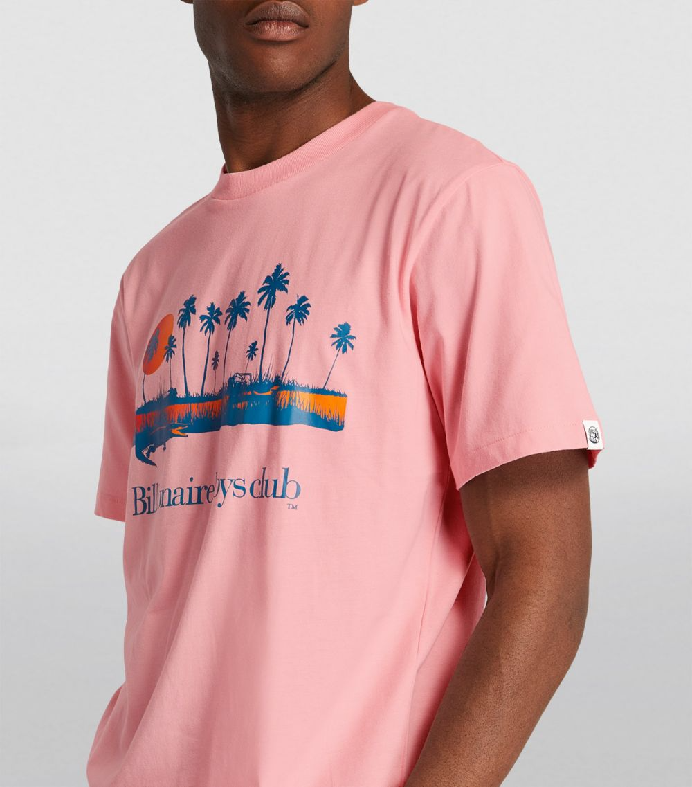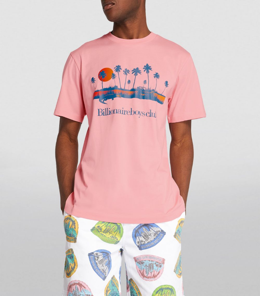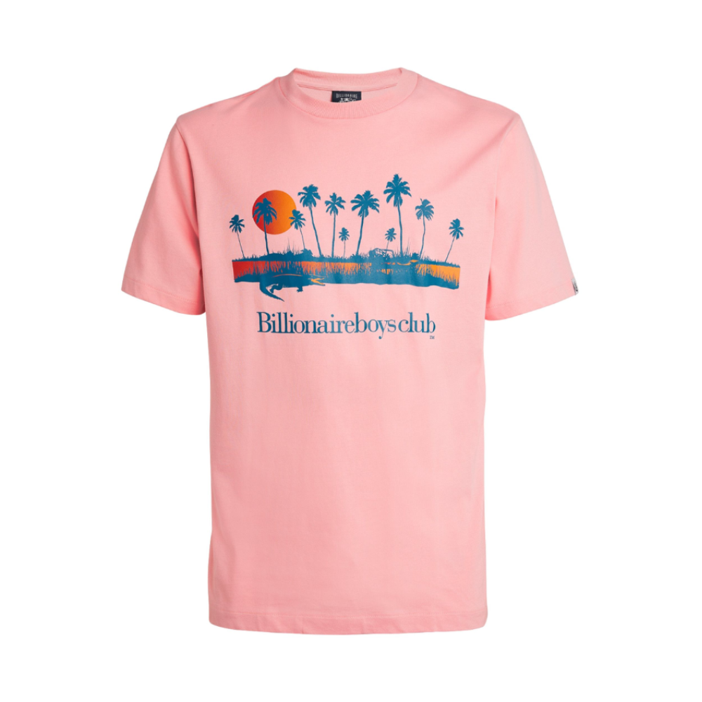 The Billionaire Boys Club Cotton Everglades T-Shirt ‘Pink’ delivers a tropical energy through its soft pastel base and vivid sunset-inspired graphic. Made from premium cotton, the tee showcases a serene Everglades landscape print featuring palm trees, a glowing sun, and vibrant water reflections — a perfect contrast to the relaxed pink tone of the fabric.