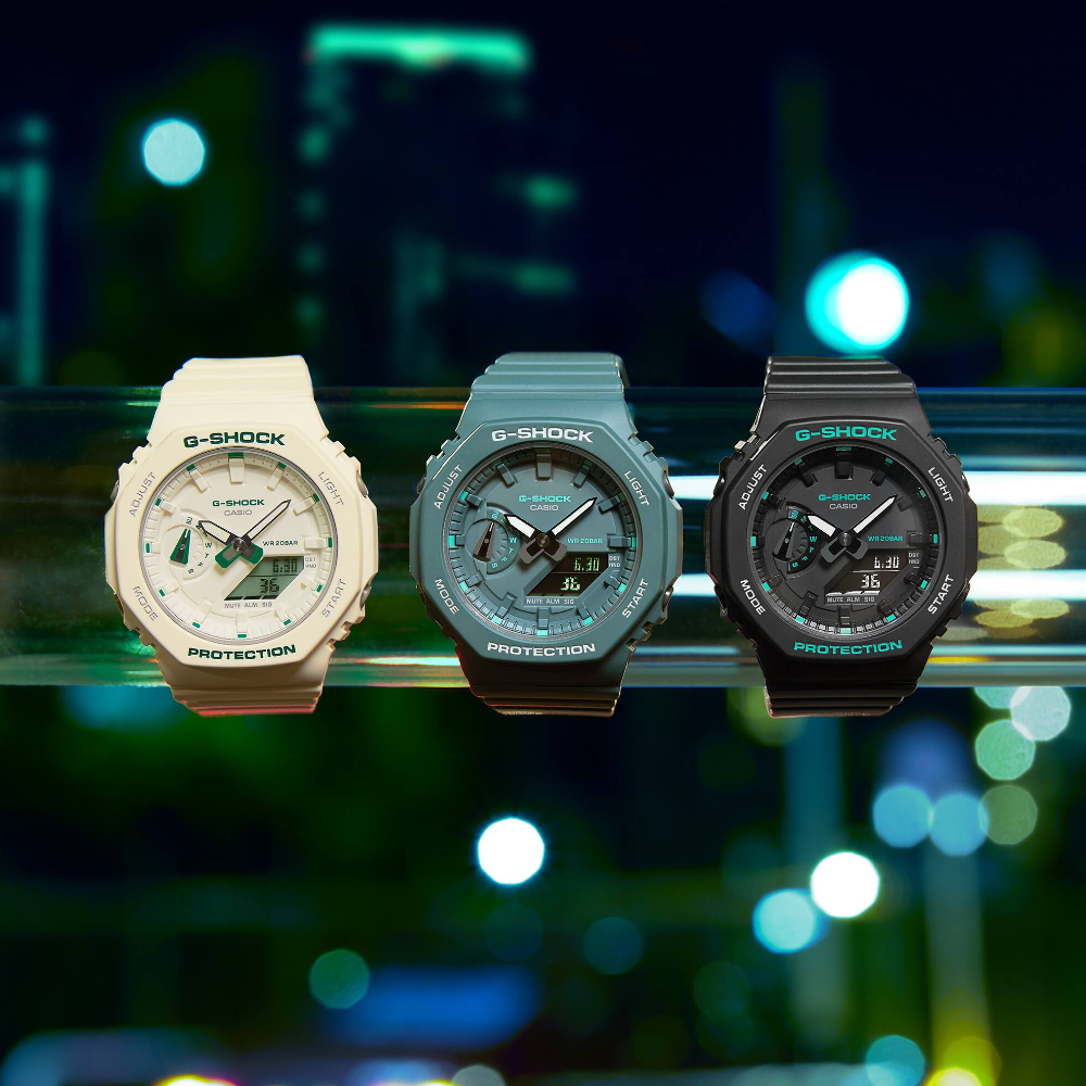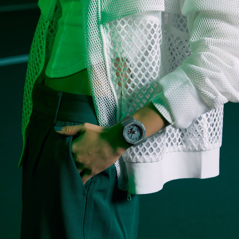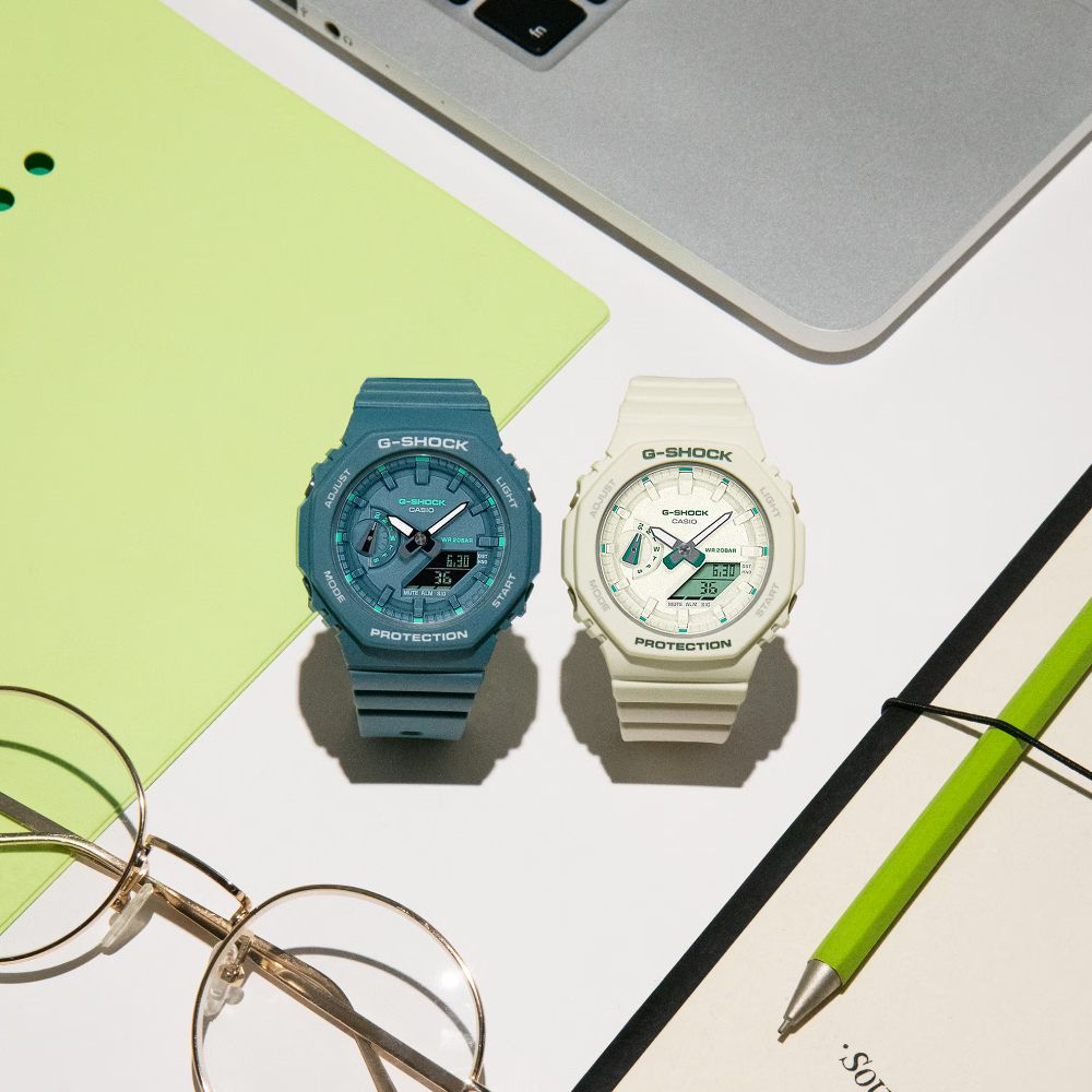 Go stylish and comfortable with the slimmer, more compact analog-digital watch featuring modern green accents. The flat face and simple bar index marks come together in a streamlined, satisfying design. An original spin in on-trend green for details like the logo, index mark, and LCD makes this watch a perfect street fashion accessory.