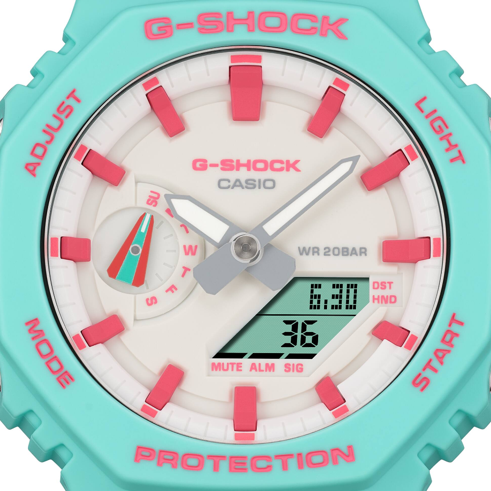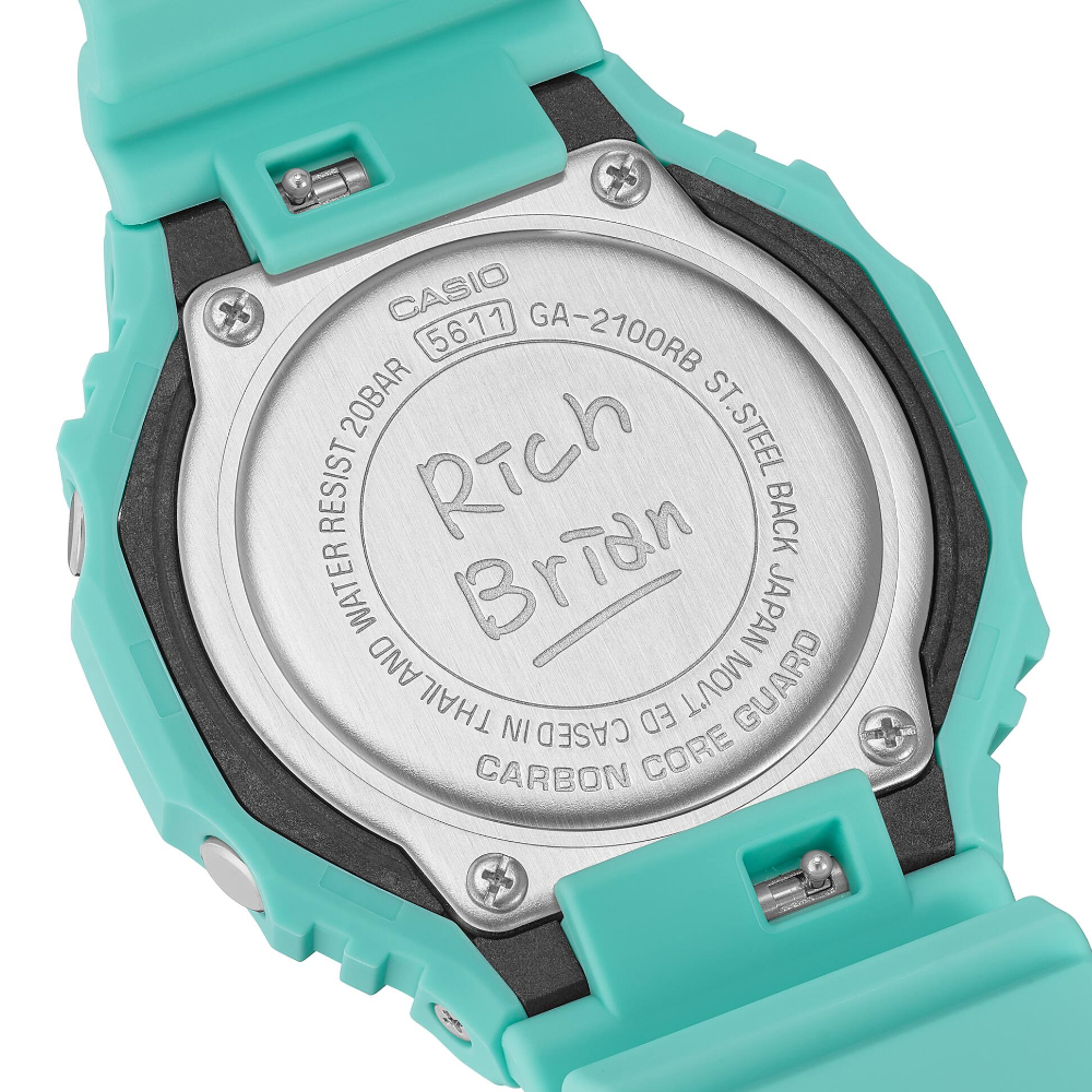 G-SHOCK, a brand known for it’s unrivaled toughness has continued to evolve in durability and functionality since its launch in 1983, a true cultural icon since inception. With such a legacy, G-SHOCK connected with Rich Brian, an esteemed label mate at 88rising, to reinterpret a timepiece of his choice. The watch Brian gravitated towards is the rugged GA-2100. It pulls design and aesthetic queues from other watches within the G-SHOCK lineage and is known for its octagonal bezel and minimalistic design. Brian’s reinterpretation is inspired by a guitar he fell in love with as a young boy in Indonesia. The bold seafoam green base color is paired with the salmon pink accents, reminiscent of the guitar Brian spent his childhood obsessing over. To complete the design, Brian’s signature adorns the case back, almost as a dedication to his younger-self. In a way, his reinterpretation serves as a reminder of his origins and unrelenting pursuit of artisanship.