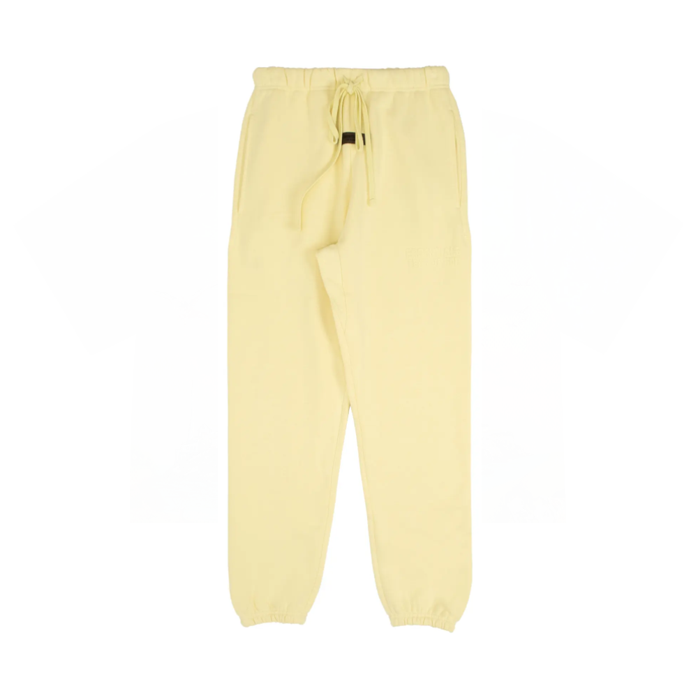 Rendered in a warm pastel yellow “Canary” hue, the design features the iconic tonal ESSENTIALS logo detailing, an elastic waistband with extended drawstrings, and elastic cuffs for a secure fit.
