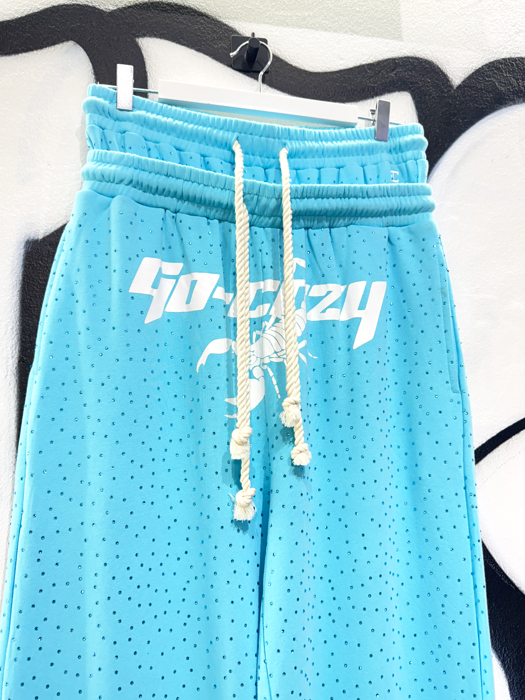 The Sky Blue base is covered with micro-rhinestones, giving them a subtle shimmer that elevates the relaxed silhouette. The bold GoCrazy logo and scorpion graphic on the front add that signature edge, while the chunky rope drawstrings and elastic waistband deliver an adjustable, secure fit.