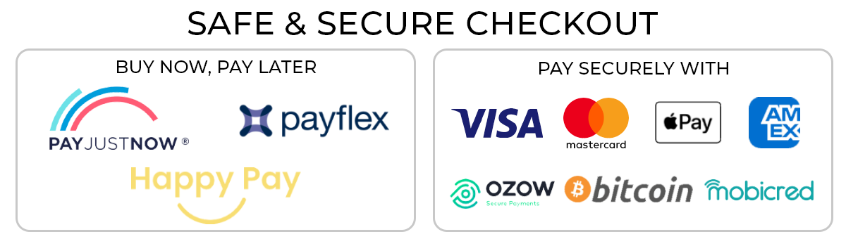 Payflex offers Visa, Mastercard and American Express Debit or Credit card payments. Payflex offers a Pay Now or a Pay Later option. Pay Later: When you shop using Payflex, you'll be able to buy what you like and pay for it in 4 equal instalments. 25% upfront, and the rest over 6 weeks - interest free! Your order is dispatched immediately.