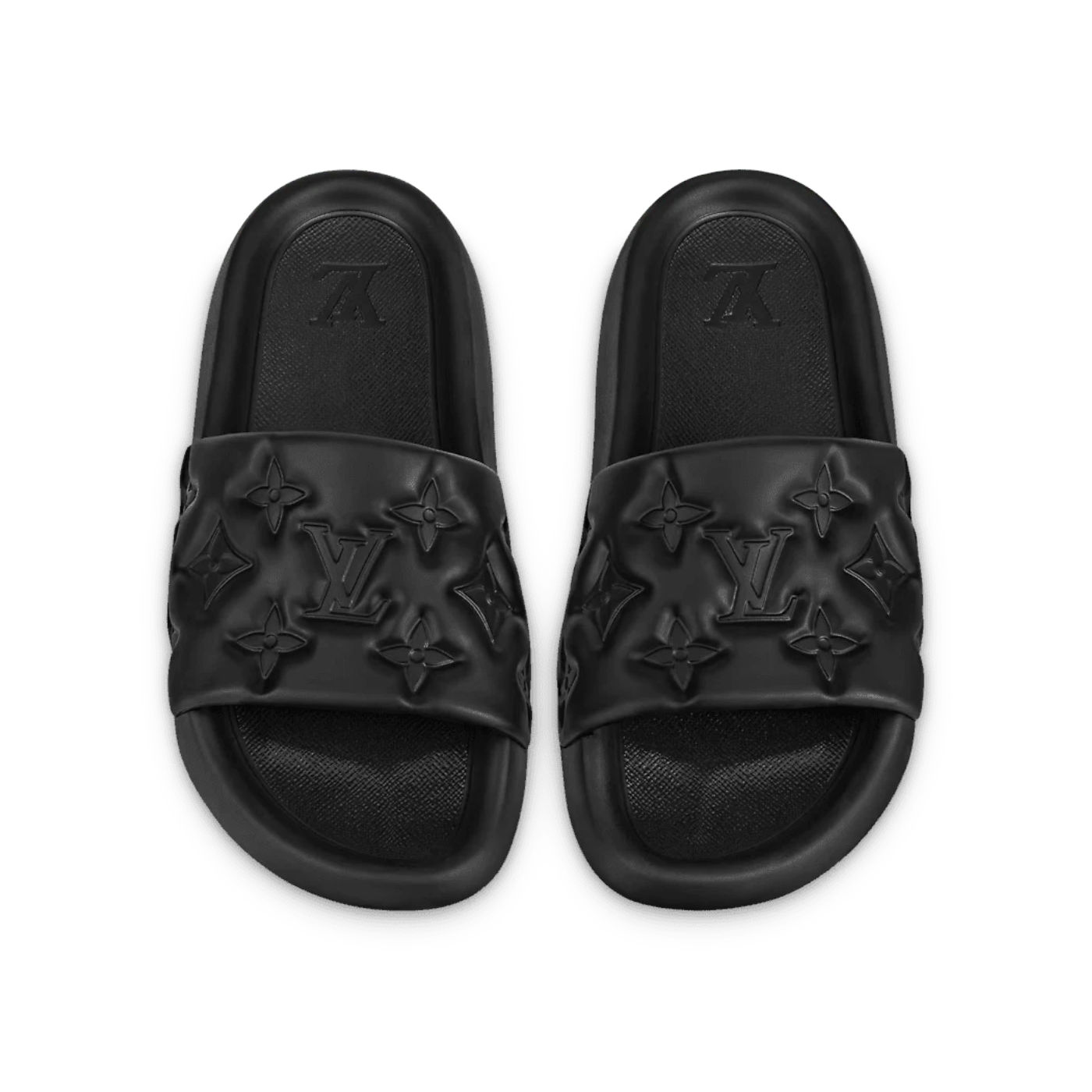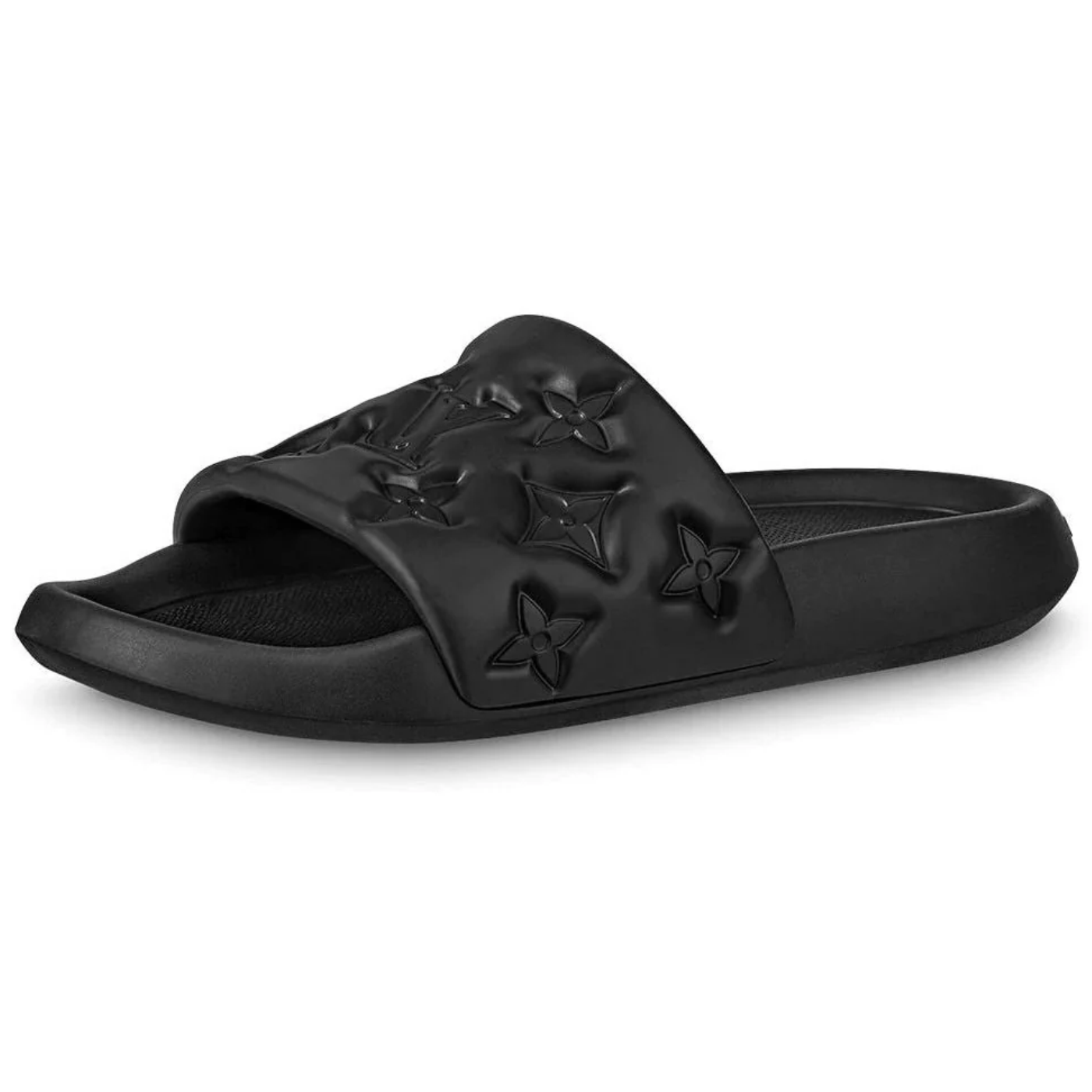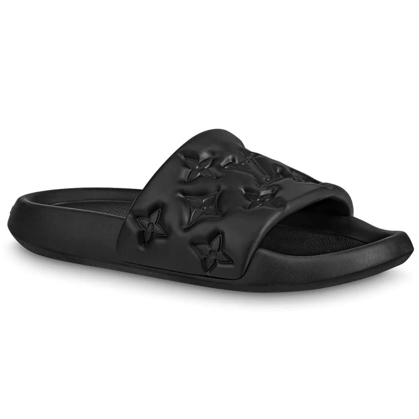 This pool slide, made of waterproof rubber, also features a comfortable anatomic insole embossed with the LV Initials. The lightweight, flexible outsole is debossed with the Louis Vuitton signature.
