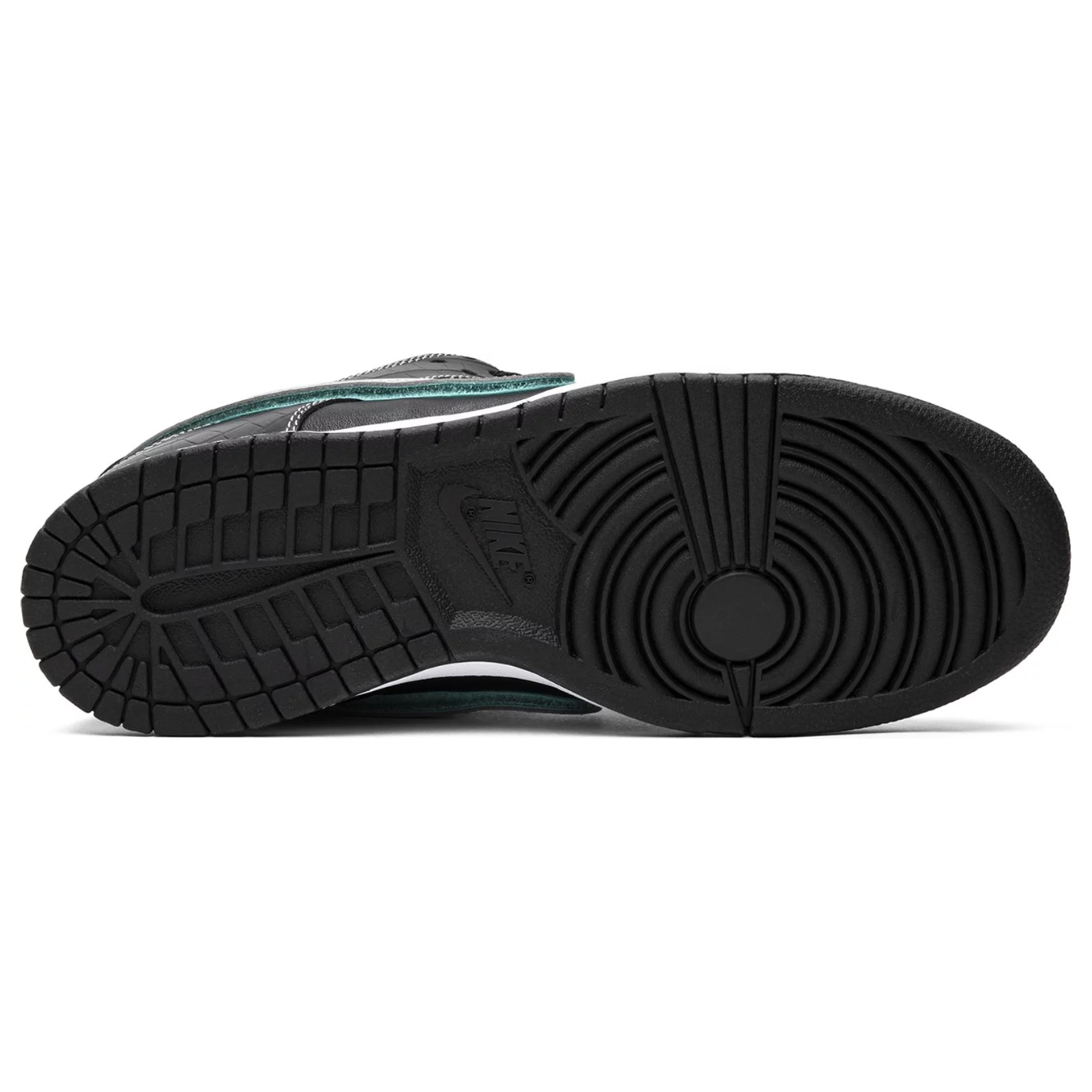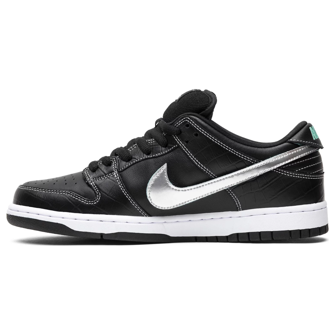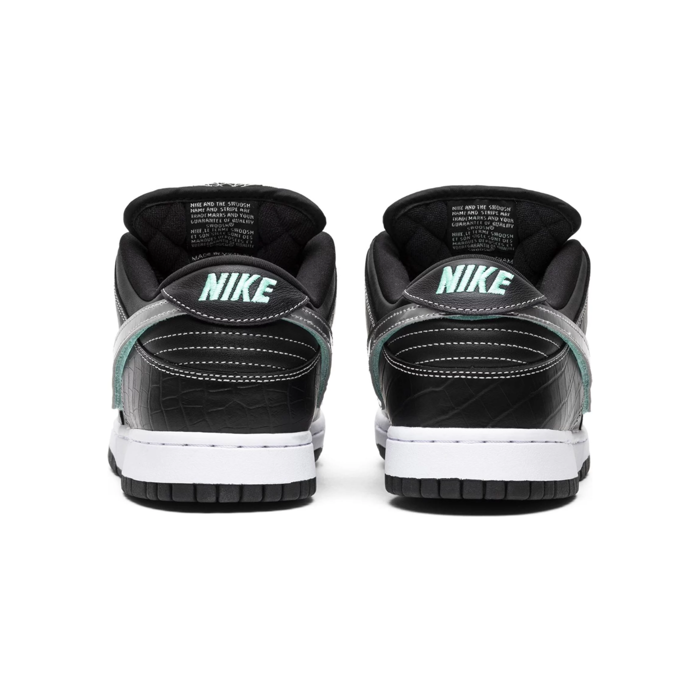The Diamond x Dunk Low SB ‘Black’ revisits the original collaboration from 2005 that effectively put the L.A. streetwear brand on the map. This joint venture from November 2018 showcases a black leather upper, accented with croc-textured overlays and contrast white stitching throughout. A one-piece removable Swoosh in metallic silver wraps around the heels and onto each quarter panel, attached via aqua-coloured Velcro underneath.