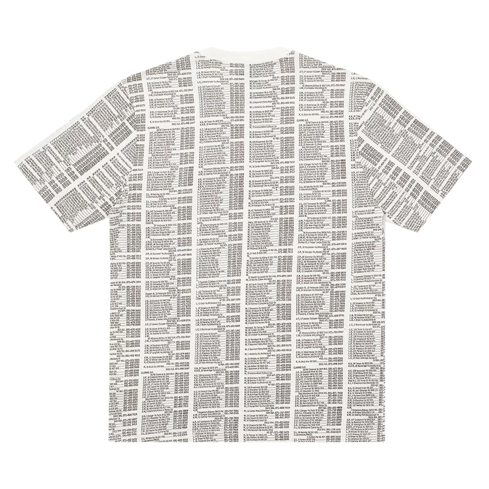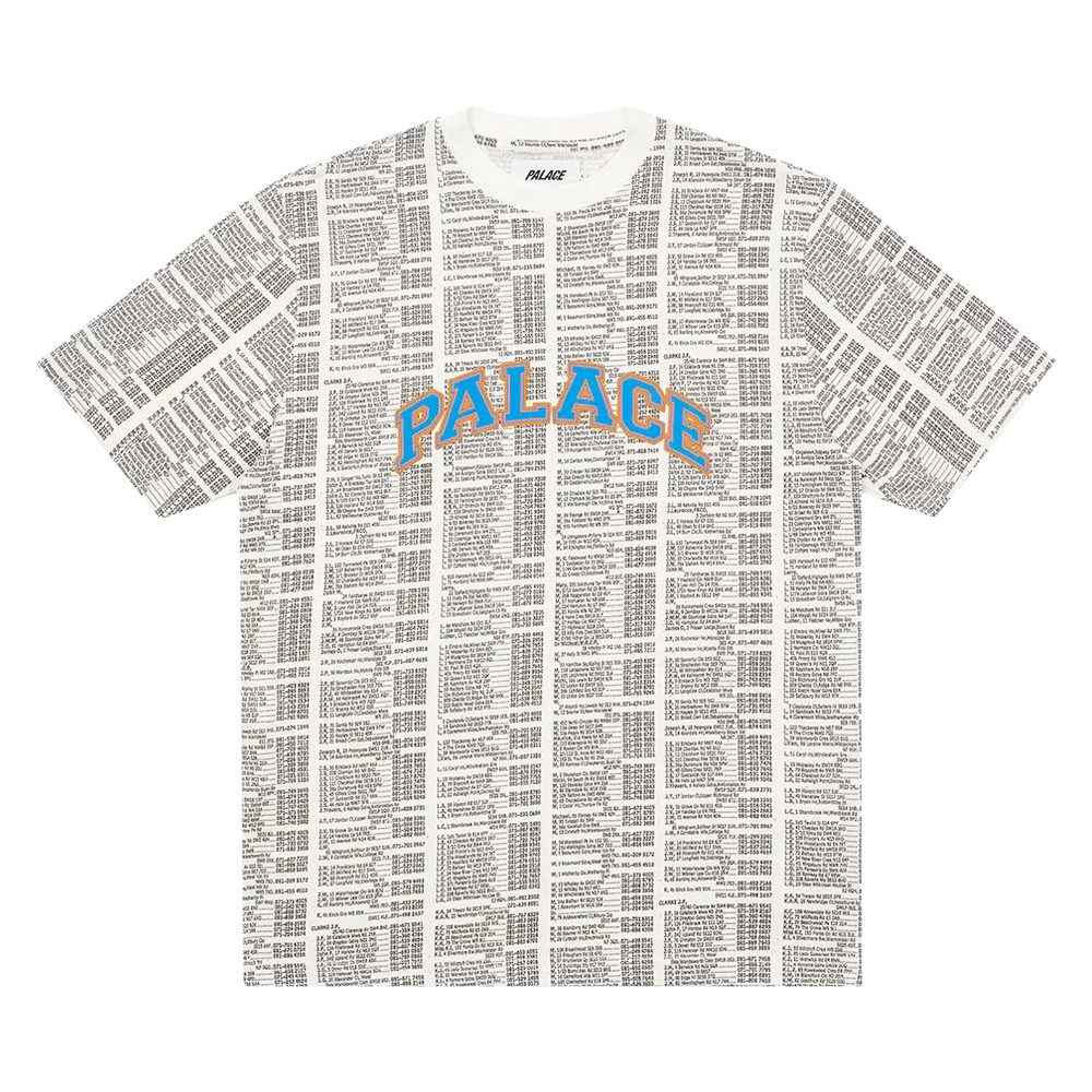 The Palace Bell Man Allover Tee ‘White’ brings a playful, graphic-heavy edge to the label’s casual staples. Featuring an all-over print that resembles vintage phone book listings, this tee merges chaotic design energy with streetwear wit.