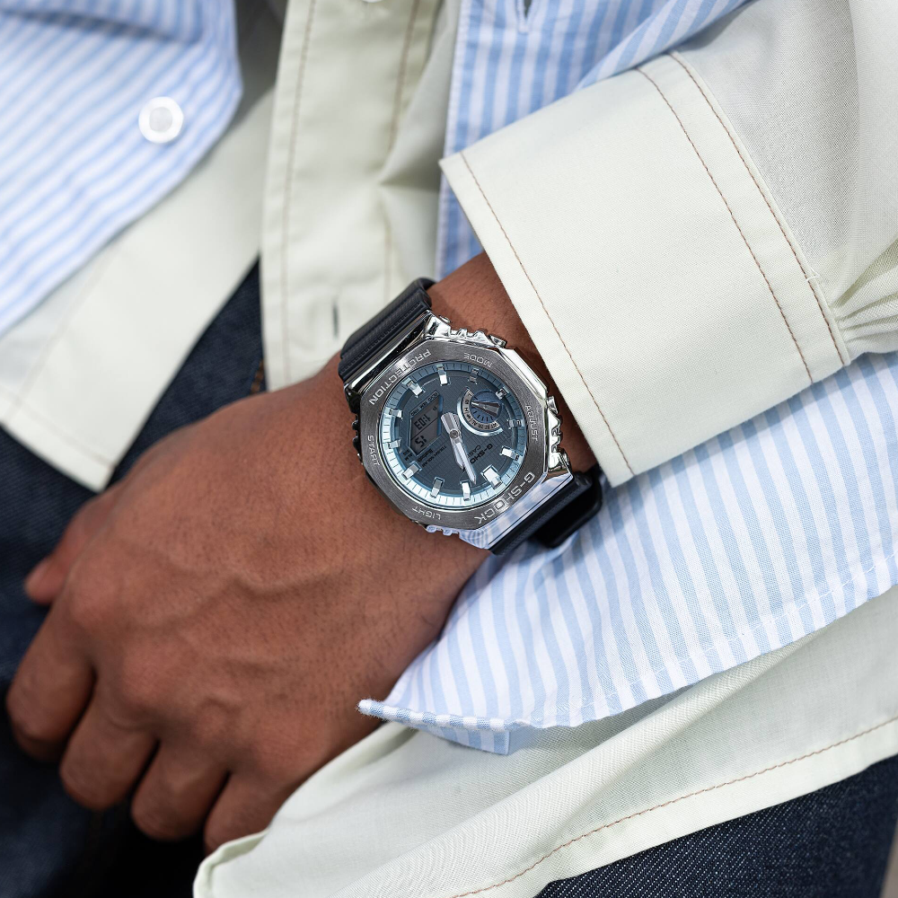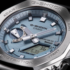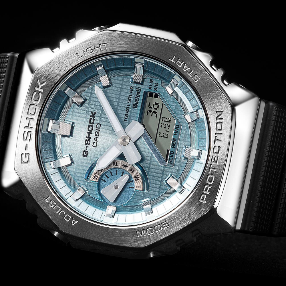 Metal-clad daring meets sophisticated gleam in a GBM-2100 that delivers Smartphone Link via Bluetooth® and Tough Solar charging system, all in a meticulously finished metal design with iconic octagonal bezel. Choose from a basic black dial or metallic vapor deposition in blue or green, each complemented by a band made of environmentally responsible bio-based resin. Welcome to a whole new level of metal-clad 2100 functionality — tough construction and stylish design in a timepiece that takes you from casual settings to business meetings without a thought.