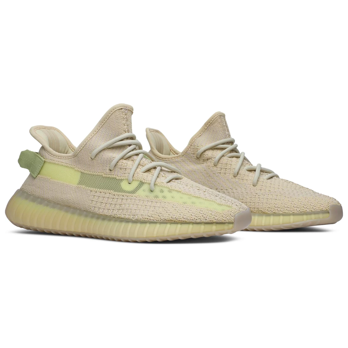 The Yeezy Boost 350 V2 'Flax' dons a breathable Primeknit upper in an understated wheat hue, complemented by tonal rope laces and a post-dyed monofilament side stripe tinted in a muted yellow finish. The lightweight knit build rides on a full-length Boost midsole, partially visible beneath a semi-translucent rubber cage with ridged detailing. The 'Flax' colourway is available only in Asia Pacific, Africa, India and the Middle East.